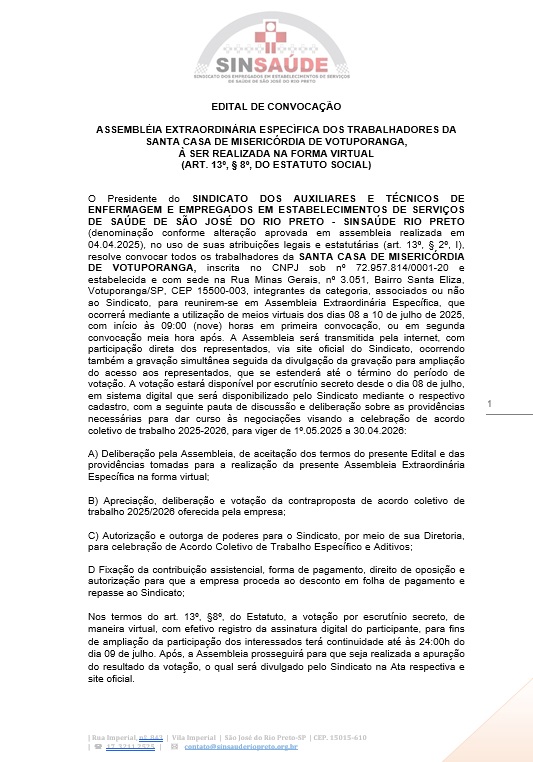 O Presidente do SINDICATO DOS AUXILIARES E TÉCNICOS DE ENFERMAGEM E EMPREGADOS EM ESTABELECIMENTOS DE SERVIÇOS DE SAÚDE DE SÃO JOSÉ DO RIO PRETO – SINSAÚDE RIO PRETO (denominação conforme alteração aprovada em assembleia realizada em 04.04.2025), no uso de suas atribuições legais e estatutárias (art. 13º, § 2º, I), resolve convocar todos os trabalhadores da SANTA CASA DE MISERICÓRDIA DE VOTUPORANGA, inscrita no CNPJ sob nº 72.957.814/0001-20 e estabelecida e com sede na Rua Minas Gerais, nº 3.051, Bairro Santa Eliza, Votuporanga/SP, CEP 15500-003, integrantes da categoria, associados ou não ao Sindicato, para reunirem-se em Assembleia Extraordinária Específica, que ocorrerá mediante a utilização de meios virtuais dos dias 08 a 10 de julho de 2025, com início às 09:00 (nove) horas em primeira convocação, ou em segunda convocação meia hora após. A Assembleia será transmitida pela internet, com participação direta dos representados, via site oficial do Sindicato, ocorrendo também a gravação simultânea seguida da divulgação da gravação para ampliação do acesso aos representados, que se estenderá até o término do período de votação. A votação estará disponível por escrutínio secreto desde o dia 08 de julho, em sistema digital que será disponibilizado pelo Sindicato mediante o respectivo cadastro, com a seguinte pauta de discussão e deliberação sobre as providências necessárias para dar curso às negociações visando a celebração de acordo coletivo de trabalho 2025-2026, para viger de 1º.05.2025 a 30.04.2026: