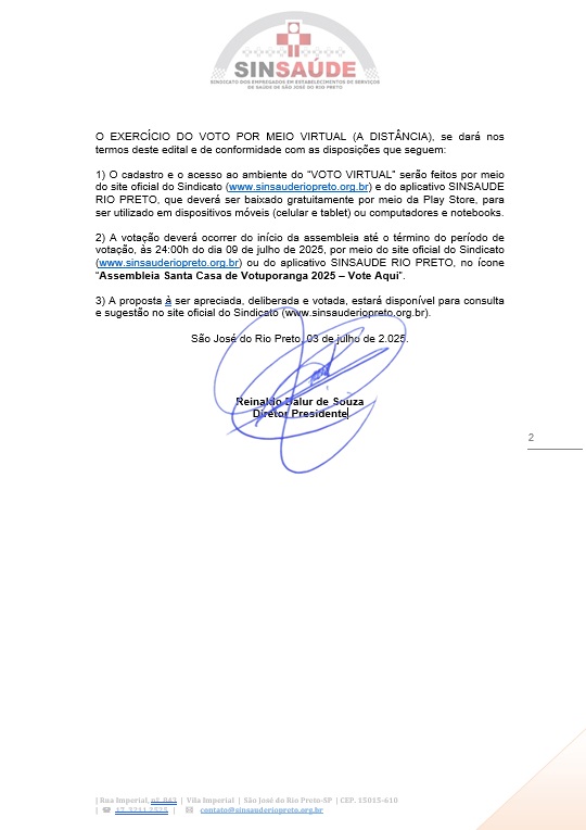 2) A votação deverá ocorrer do início da assembleia até o término do período de votação, às 24:00h do dia 09 de julho de 2025, por meio do site oficial do Sindicato (www.sinsauderiopreto.org.br) ou do aplicativo SINSAUDE RIO PRETO, no ícone “Assembleia Santa Casa de Votuporanga 2025 – Vote Aqui”.