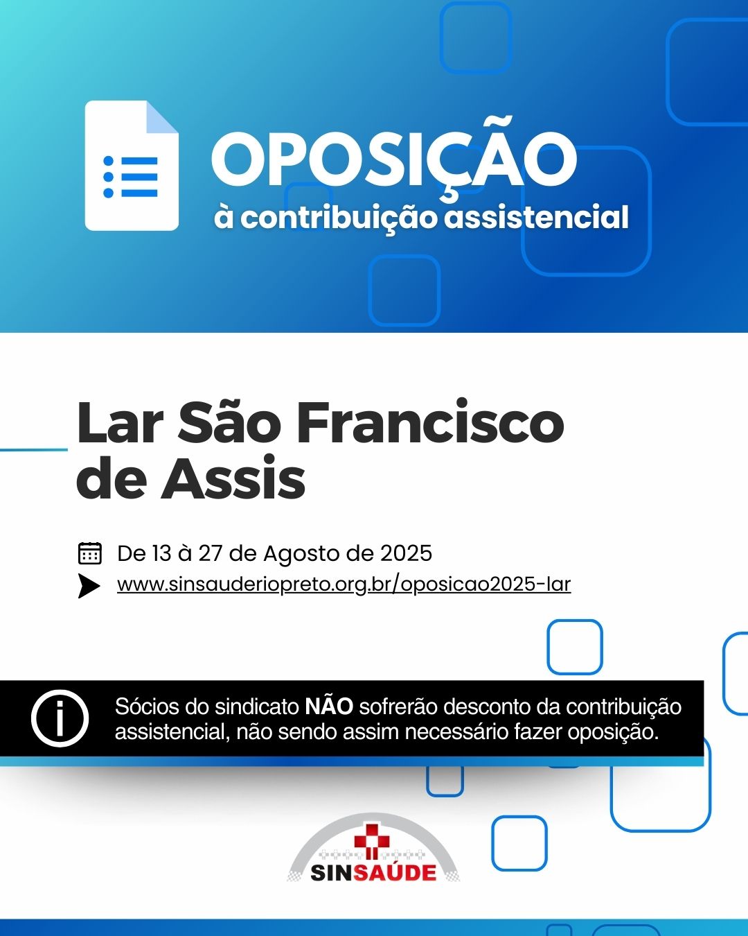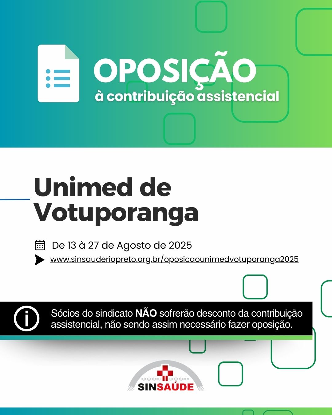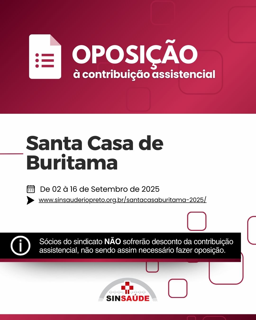 EDITAL DE CONVOCAÇÃO ASSEMBLEIA EXTRAORDINÁRIA ESPECÍFICA DOS TRABALHADORES DA CATEGORIA PROFISSIONAL QUE LABORAM NAS ENTIDADES REPRESENTADAS PELO SINDICATO DAS SANTAS CASAS DE MISERICÓRDIA E HOSPITAIS FILANTRÓPICOS DE RIBEIRÃO PRETO E REGIÃO, A SER REALIZADA NA FORMA VIRTUAL (ART. 13º, § 8º, DO ESTATUTO SOCIAL) O Presidente do SINDICATO DOS AUXILIARES E TÉCNICOS DE ENFERMAGEM E EMPREGADOS EM ESTABELECIMENTOS DE SERVIÇOS DE SAÚDE DE SÃO JOSÉ DO RIO PRETO – SINSAÚDE RIO PRETO (Denominação adotada a partir da Reforma Estatutária aprovada em 04/04/2025, devidamente registrada), no uso de suas atribuições legais e estatutárias, resolve convocar todos os trabalhadores da categoria profissional que laboram nas entidades representadas pelo SINDICATO DAS SANTAS CASAS DE MISERICÓRDIA E HOSPITAIS FILANTRÓPICOS DE RIBEIRÃO PRETO E REGIÃO, entidade sindical patronal, inscrita no CNPJ nº 05.436.103/0001-12, com sede na cidade de Ribeirão Preto/SP, na Avenida Costabile Romano, nº 2572, bairro Ribeirânia, CEP 14096-030, associados ou não ao Sindicato, para reunirem-se em Assembleia Geral Específica (que ocorrerá mediante a utilização de meios virtuais), a realizar-se dos dias 12 a 14 de agosto de 2025, com início às 09:00 (nove) horas em primeira convocação, ou em segunda convocação meia hora após. A Assembleia será transmitida pela internet, com participação direta dos representados, via site oficial do Sindicato, ocorrendo também a gravação simultânea da assembleia, seguida da publicação para ampliação do acesso aos representados, até o término do período de votação. A votação estará disponível por escrutínio secreto em sistema digital que será disponibilizado pelo Sindicato mediante o respectivo cadastro, com a seguinte pauta de discussão e deliberação sobre as providências necessárias para dar curso às negociações visando a celebração da Convenção Coletiva de Trabalho 2025-2026: A) Deliberação pela Assembleia de aceitação dos termos do presente Edital e das providências tomadas para a realização da presente Assembleia Extraordinária Específica, na forma virtual; B) Apreciação, deliberação e votação da proposta de Convenção Coletiva de Trabalho 2025/2026 oferecida pelo Sindicato patronal SINDHOSFIL; C) Autorização e outorga de poderes para que o Sindicato, por meio de sua Diretoria, celebre Convenção Coletiva de Trabalho Específica e Aditivos; D) Fixação das formas de pagamento da contribuição assistencial, bem como do prazo e formas de exercício do direito de oposição e autorização para que a empresa proceda ao desconto em folha de pagamento e o repasse ao Sindicato; Nos termos do art. 13º, §8º, do Estatuto, para fins de ampliação da participação dos interessados, a votação estará disponível desde o início dos trabalhos da assembleia no dia 12.08.2025 e terá continuidade até às 24:00h do dia 13.08.2025. No dia útil imediatamente posterior, a Assembleia prosseguirá para que seja realizada a apuração do resultado da votação, o qual será divulgado pelo Sindicato na Ata respectiva. O EXERCÍCIO DO VOTO POR MEIO VIRTUAL (À DISTÂNCIA), se dará nos termos deste Edital e em conformidade com as disposições que seguem: 1) O acesso ao ambiente do “VOTO VIRTUAL” será feito por meio do site oficial do Sindicato (www.sinsauderiopreto.org.br) e do aplicativo SINSAUDE RIO PRETO, que deverá ser baixado gratuitamente por meio da Play Store, para ser utilizado em dispositivos móveis (celular e tablet) ou computadores e notebooks. 2) A votação deverá ocorrer do início da assembleia até o término do período de votação, às 24:00h do dia 13.08.2025, por meio do site oficial do Sindicato (www.sinsauderiopreto.org.br) ou do aplicativo SINSAUDE RIO PRETO, no ícone “Assembleia – SINDHOSFIL 2025”. 3) A proposta a ser apreciada, deliberada e votada, estará disponível para consulta e sugestões no site oficial do Sindicato (www.sinsauderiopreto.org.br), bem como na Sede. São José do Rio Preto, 07 de agosto de 2025. Reinaldo Dalur de Souza Diretor Presidente