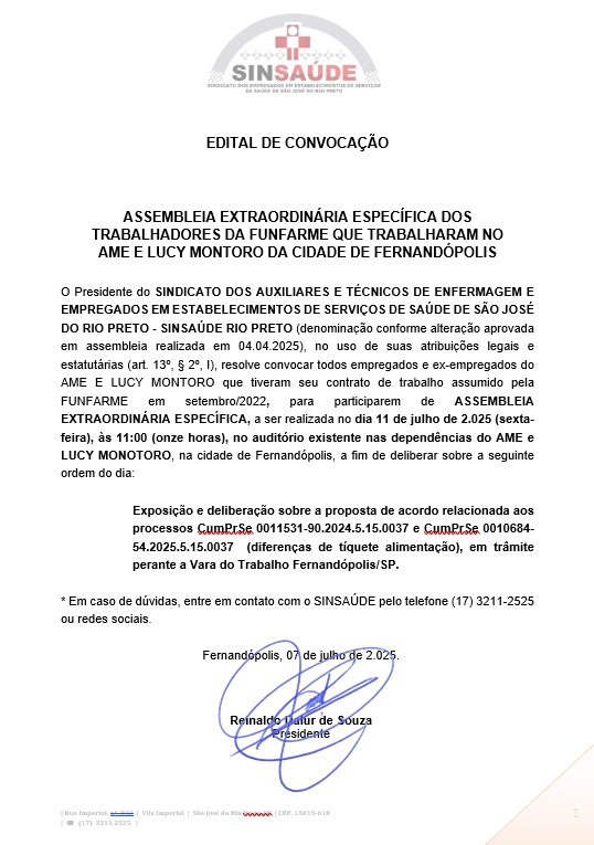 O Presidente do SINDICATO DOS AUXILIARES E TÉCNICOS DE ENFERMAGEM E EMPREGADOS EM ESTABELECIMENTOS DE SERVIÇOS DE SAÚDE DE SÃO JOSÉ DO RIO PRETO – SINSAÚDE RIO PRETO (denominação conforme alteração aprovada em assembleia realizada em 04.04.2025), no uso de suas atribuições legais e estatutárias (art. 13º, § 2º, I), resolve convocar todos empregados e ex-empregados do AME E LUCY MONTORO que tiveram seu contrato de trabalho assumido pela FUNFARME em setembro/2022, para participarem de ASSEMBLEIA EXTRAORDINÁRIA ESPECÍFICA, a ser realizada no dia 11 de julho de 2.025 (sexta-feira), às 11:00 (onze horas), no auditório existente nas dependências do AME e LUCY MONOTORO, na cidade de Fernandópolis, a fim de deliberar sobre a seguinte ordem do dia: