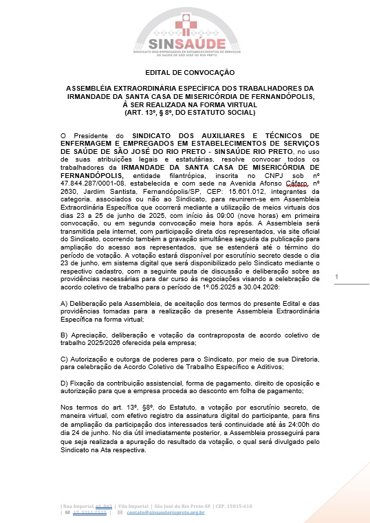 O Presidente do SINDICATO DOS AUXILIARES E TÉCNICOS DE ENFERMAGEM E EMPREGADOS EM ESTABELECIMENTOS DE SERVIÇOS DE SAÚDE DE SÃO JOSÉ DO RIO PRETO – SINSAÚDE RIO PRETO, no uso de suas atribuições legais e estatutárias, resolve convocar todos os trabalhadores da IRMANDADE DA SANTA CASA DE MISERICÓRDIA DE FERNANDÓPOLIS, entidade filantrópica, inscrita no CNPJ sob nº 47.844.287/0001-08, estabelecida e com sede na Avenida Afonso Cáfaro, nº 2630, Jardim Santista, Fernandópolis/SP, CEP: 15.601.012, integrantes da categoria, associados ou não ao Sindicato, para reunirem-se em Assembleia Extraordinária Específica que ocorrerá mediante a utilização de meios virtuais dos dias 23 a 25 de junho de 2025, com início às 09:00 (nove horas) em primeira convocação, ou em segunda convocação meia hora após. A Assembleia será transmitida pela internet, com participação direta dos representados, via site oficial do Sindicato, ocorrendo também a gravação simultânea seguida da publicação para ampliação do acesso aos representados, que se estenderá até o término do período de votação. A votação estará disponível por escrutínio secreto desde o dia 23 de junho, em sistema digital que será disponibilizado pelo Sindicato mediante o respectivo cadastro, com a seguinte pauta de discussão e deliberação sobre as providências necessárias para dar curso às negociações visando a celebração de acordo coletivo de trabalho para o período de 1º.05.2025 a 30.04.2026:
