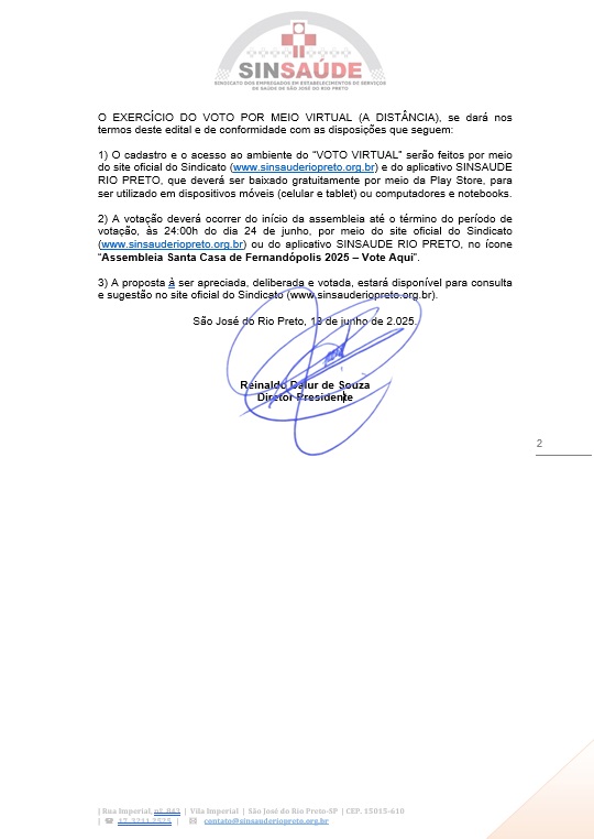 2) A votação deverá ocorrer do início da assembleia até o término do período de votação, às 24:00h do dia 24 de junho, por meio do site oficial do Sindicato (www.sinsauderiopreto.org.br) ou do aplicativo SINSAUDE RIO PRETO, no ícone “Assembleia Santa Casa de Fernandópolis 2025 – Vote Aqui”.