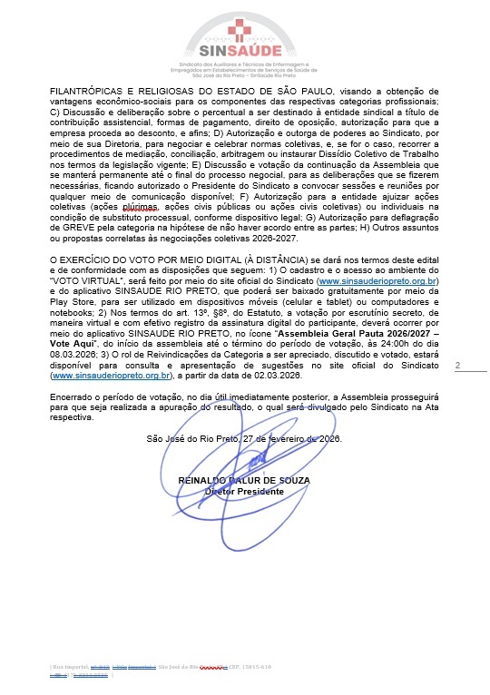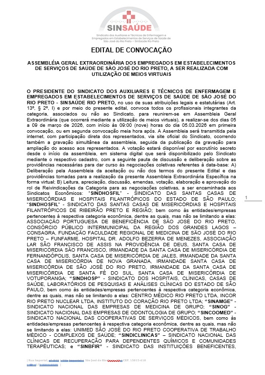 O PRESIDENTE DO SINDICATO DOS AUXILIARES E TÉCNICOS DE ENFERMAGEM E EMPREGADOS EM ESTABELECIMENTOS DE SERVIÇOS DE SAÚDE DE SÃO JOSÉ DO RIO PRETO – SINSAÚDE RIO PRETO, no uso de suas atribuições legais e estatutárias (Art. 13º, § 2º, I) e por meio do presente edital, convoca todos os profissionais integrantes da categoria, associados ou não ao Sindicato, para reunirem-se em Assembleia Geral Extraordinária (que ocorrerá mediante a utilização de meios virtuais), a realizar-se dos dias 05 a 09 de março de 2026, com início às 09:00 (nove) horas do dia 05.03.2026 em primeira convocação, ou em segunda convocação meia hora após. A Assembleia será transmitida pela internet, com participação direta dos representados, via site oficial do Sindicato, ocorrendo também a gravação simultânea da assembleia, seguida da publicação da gravação para ampliação do acesso aos representados. A votação estará disponível por escrutínio secreto desde o início da assembleia, em sistema digital que será disponibilizado pelo Sindicato mediante o respectivo cadastro, com a seguinte pauta de discussão e deliberação sobre as providências necessárias para dar curso às negociações coletivas referentes à data-base: A) Deliberação pela Assembleia da aceitação ou não dos termos do presente Edital e das providências tomadas para a realização da presente Assembleia Extraordinária Específica na forma virtual; B) Leitura, apreciação, discussão, emendas, votação, elaboração e aprovação do rol de Reivindicações da Categoria para as negociações coletivas, a ser encaminhada aos Sindicatos Econômicos: “SINDHOSFIL” – SINDICATO DAS SANTAS CASAS DE MISERICÓRDIAS E HOSPITAIS FILANTRÓPICOS DO ESTADO DE SÃO PAULO; “SINDHOSFIL” – SINDICATO DAS SANTAS CASAS DE MISERICÓRDIAS E HOSPITAIS FILANTRÓPICOS DE RIBEIRÃO PRETO E REGIÃO; bem como às entidades/empresas pertencentes à respectiva categoria econômica, dentre as quais, mas não se limitando a elas: ASSOCIAÇÃO PORTUGUESA DE BENEFICÊNCIA DE SÃO JOSÉ DO RIO PRETO, CONSÓRCIO PÚBLICO INTERMUNICIPAL DA REGIÃO DOS GRANDES LAGOS – CONSAGRA, FUNDAÇÃO FACULDADE REGIONAL DE MEDICINA DE SÃO JOSÉ DO RIO PRETO – FUNFARME, HOSPITAL DR. ADOLFO BEZERRA DE MENEZES, ASSOCIAÇÃO LAR SÃO FRANCISCO DE ASSIS NA PROVIDÊNCIA DE DEUS, SANTA CASA DE MISERICÓRDIA SÃO FRANCISCO, IRMANDADE DA SANTA CASA DE MISERICÓRDIA DE FERNANDÓPOLIS, SANTA CASA DE MISERICÓRDIA DE JALES, IRMANDADE DA SANTA CASA DE MISERICÓRDIA DE NOVA GRANADA, IRMANDADE SANTA CASA DE MISERICÓRDIA DE SÃO JOSÉ DO RIO PRETO, IRMANDADE DA SANTA CASA DE MISERICÓRDIA DE SANTA FÉ DO SUL, SANTA CASA DE MISERICÓRDIA DE VOTUPORANGA; “SINDHOSP” – SINDICATO DOS HOSPITAIS, CLÍNICAS, CASAS DE SAÚDE, LABORATÓRIOS DE PESQUISAS E ANÁLISES CLÍNICAS DO ESTADO DE SÃO PAULO, bem como às entidades/empresas pertencentes à respectiva categoria econômica, dentre as quais, mas não se limitando a elas: CENTRO MÉDICO RIO PRETO LTDA, INCOR RIO PRETO NUCLEAR LTDA, INSTITUTO DO CORAÇÃO RIO PRETO LTDA; “SINAMGE” – SINDICATO NACIONAL DAS EMPRESAS DE MEDICINA DE GRUPO; “SINOG” – SINDICATO NACIONAL DAS EMPRESAS DE ODONTOLOGIA DE GRUPO; “SINCOOMED” – SINDICATO NACIONAL DAS COOPERATIVAS DE SERVIÇOS MÉDICOS, bem como às entidades/empresas pertencentes à respectiva categoria econômica, dentre as quais, mas não se limitando a elas: UNIMED SÃO JOSÉ DO RIO PRETO COOPERATIVA DE TRABALHO MÉDICO – COMPLEXOS DE SAÚDE; “SINDICLINICAS” – SINDICATO NACIONAL DAS CLÍNICAS DE RECUPERAÇÃO PARA DEPENDENTES QUÍMICOS E COMUNIDADES TERAPÊUTICAS; e “SINBFIR” Sindicato das Instituições Beneficentes, Filantrópicas e Religiosas do Estado de São Paulo, visando a obtenção de vantagens econômico-sociais para os componentes das respectivas categorias profissionais; C) Discussão e deliberação sobre o percentual a ser destinado à entidade sindical a título de contribuição assistencial, formas de pagamento, direito de oposição, autorização para que a empresa proceda ao desconto, e afins; D) Autorização e outorga de poderes ao Sindicato, por meio de sua Diretoria, para negociar e celebrar normas coletivas, e, se for o caso, recorrer a procedimentos de mediação, conciliação, arbitragem ou instaurar Dissídio Coletivo de Trabalho nos termos da legislação vigente; E) Discussão e votação da continuação da Assembleia que se manterá permanente até o final do processo negocial, para as deliberações que se fizerem necessárias, ficando autorizado o Presidente do Sindicato a convocar sessões e reuniões por qualquer meio de comunicação disponível; F) Autorização para a entidade ajuizar ações coletivas (ações plúrimas, ações civis públicas ou ações civis coletivas) ou individuais na condição de substituto processual, conforme dispositivo legal; G) Autorização para deflagração de GREVE pela categoria na hipótese de não haver acordo entre as partes; H) Outros assuntos ou propostas correlatas às negociações coletivas 2026-2027.