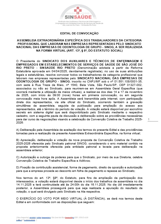 O Presidente do SINDICATO DOS AUXILIARES E TÉCNICOS DE ENFERMAGEM E EMPREGADOS EM ESTABELECIMENTOS DE SERVIÇOS DE SAÚDE DE SÃO JOSÉ DO RIO PRETO – SINSAÚDE RIO PRETO (Denominação adotada a partir da Reforma Estatutária aprovada em 04/04/2025, devidamente registrada), no uso de suas atribuições legais e estatutárias, resolve convocar todos os trabalhadores da categoria profissional que laboram nas empresas representadas pelo SINDICATO NACIONAL DAS EMPRESAS DE ODONTOLOGIA DE GRUPO – SINOG, inscrito no CNPJ/MF sob o nº 01.551.108/0001-35, com sede à Rua Treze de Maio, nº 1540, Bela Vista, São Paulo/SP, CEP 01327-002, associados ou não ao Sindicato, para reunirem-se em Assembleia Geral Específica (que ocorrerá mediante a utilização de meios virtuais), a realizar-se dos dias 14 a 17 de novembro de 2025, com início às 09:00 (nove) horas em primeira convocação, ou em segunda convocação meia hora após. A Assembleia será transmitida pela internet, com participação direta dos representados, via site oficial do Sindicato, ocorrendo também a gravação simultânea da assembleia, seguida da publicação para ampliação do acesso aos representados, até o término do período de votação. A votação estará disponível por escrutínio secreto em sistema digital que será disponibilizado pelo Sindicato mediante o respectivo cadastro, com a seguinte pauta de discussão e deliberação sobre as providências necessárias para dar curso às negociações visando a celebração da Convenção Coletiva de Trabalho 2025-2026: