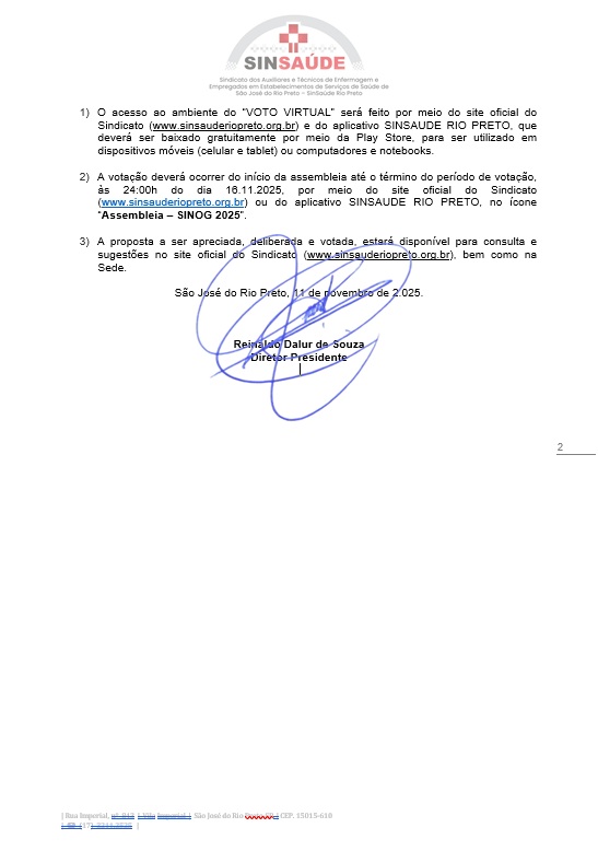 • A votação deverá ocorrer do início da assembleia até o término do período de votação, às 24:00h do dia 16.11.2025, por meio do site oficial do Sindicato (www.sinsauderiopreto.org.br) ou do aplicativo SINSAUDE RIO PRETO, no ícone “Assembleia – SINOG 2025”.