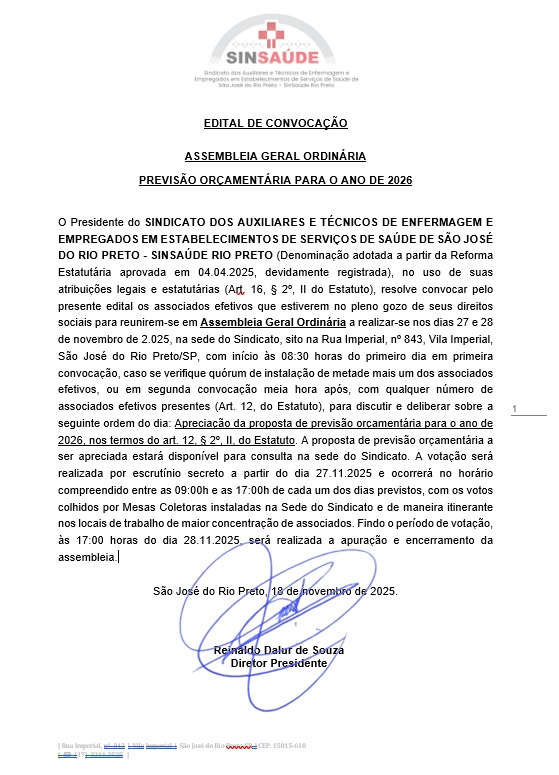 O Presidente do SINDICATO DOS AUXILIARES E TÉCNICOS DE ENFERMAGEM E EMPREGADOS EM ESTABELECIMENTOS DE SERVIÇOS DE SAÚDE DE SÃO JOSÉ DO RIO PRETO – SINSAÚDE RIO PRETO (Denominação adotada a partir da Reforma Estatutária aprovada em 04.04.2025, devidamente registrada),no uso de suas atribuições legais e estatutárias (Art. 16, § 2º, II do Estatuto), resolve convocar pelo presente edital os associados efetivos que estiverem no pleno gozo de seus direitos sociais para reunirem-se em Assembleia Geral Ordinária a realizar-se nos dias 27 e 28 de novembro de 2.025, na sede do Sindicato, sito na Rua Imperial, nº 843, Vila Imperial, São José do Rio Preto/SP, com início às 08:30 horas do primeiro dia em primeira convocação, caso se verifique quórum de instalação de metade mais um dos associados efetivos, ou em segunda convocação meia hora após, com qualquer número de associados efetivos presentes (Art. 12, do Estatuto), para discutir e deliberar sobre a seguinte ordem do dia: Apreciação da proposta de previsão orçamentária para o ano de 2026, nos termos do art. 12, § 2º, II, do Estatuto. A proposta de previsão orçamentária a ser apreciada estará disponível para consulta na sede do Sindicato. A votação será realizada por escrutínio secreto a partir do dia 27.11.2025 e ocorrerá no horário compreendido entre as 09:00h e as 17:00h de cada um dos dias previstos, com os votos colhidos por Mesas Coletoras instaladas na Sede do Sindicato e de maneira itinerante nos locais de trabalho de maior concentração de associados. Findo o período de votação, às 17:00 horas do dia 28.11.2025, será realizada a apuração e encerramento da assembleia.