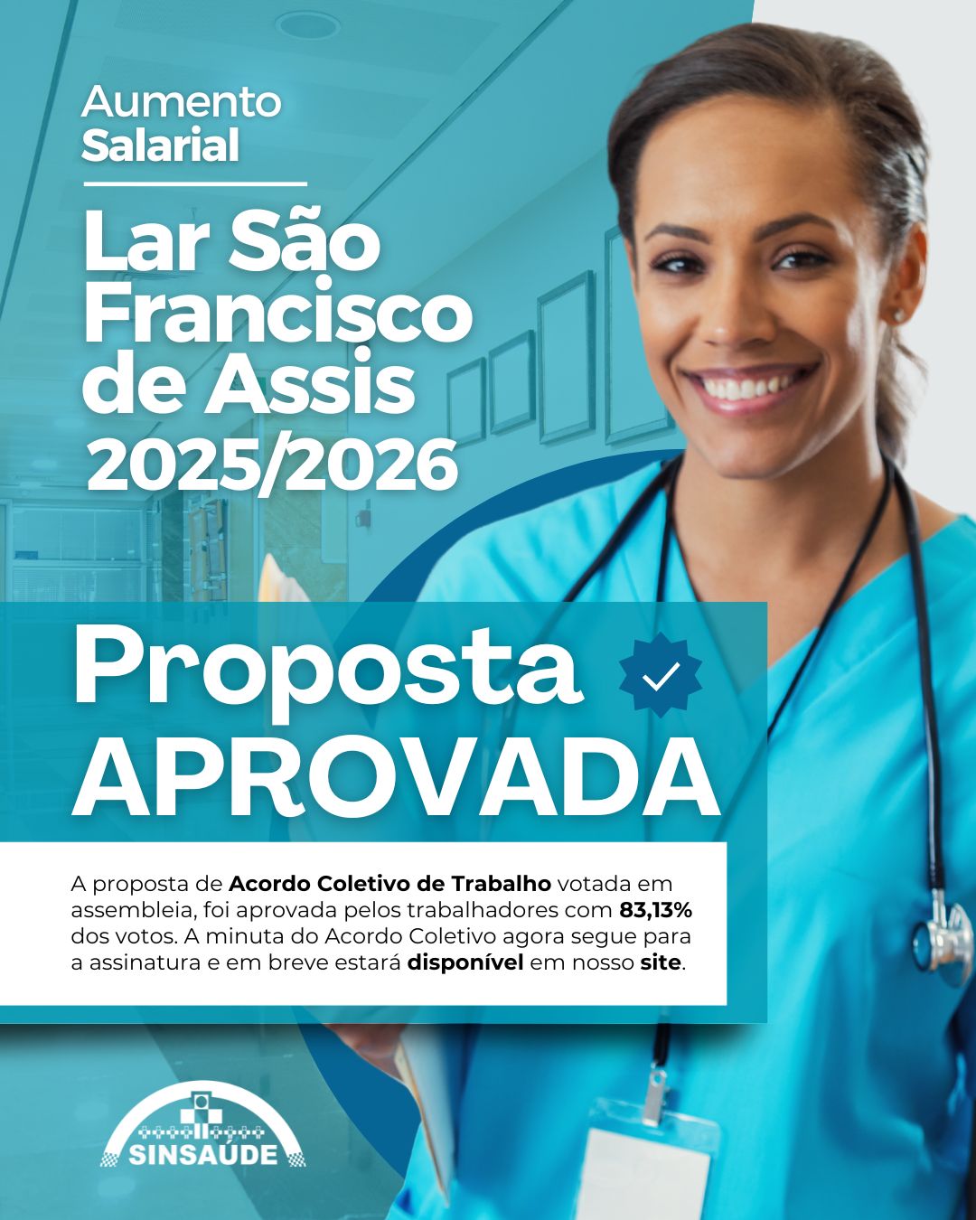 Aumento Salarial 2025 – Proposta de Pauta APROVADA! 💪 A proposta de Acordo Coletivo de Trabalho dos trabalhadores do LAR SÃO FRANCISCO DE ASSIS, foi aprovada pelos trabalhadores com 83,13% dos votos. Agora, a minuta segue para assinatura e, em breve, estará disponível no nosso site. ✅ ✅ Seguimos firmes na luta por melhores condições para os trabalhadores da saúde! 📞Contato SinSaúde Rio Preto: Telefone: (17) 3211-2525 ou WhatsApp: (17) 99794-8476 🕗 Horário de atendimento:🕗 Segunda a Sexta-feira⏰ Manhã: 08h às 11h30⏰ Tarde: 12h30 às 17h 📍 Endereço: Rua Imperial, 843, Vila Imperial.