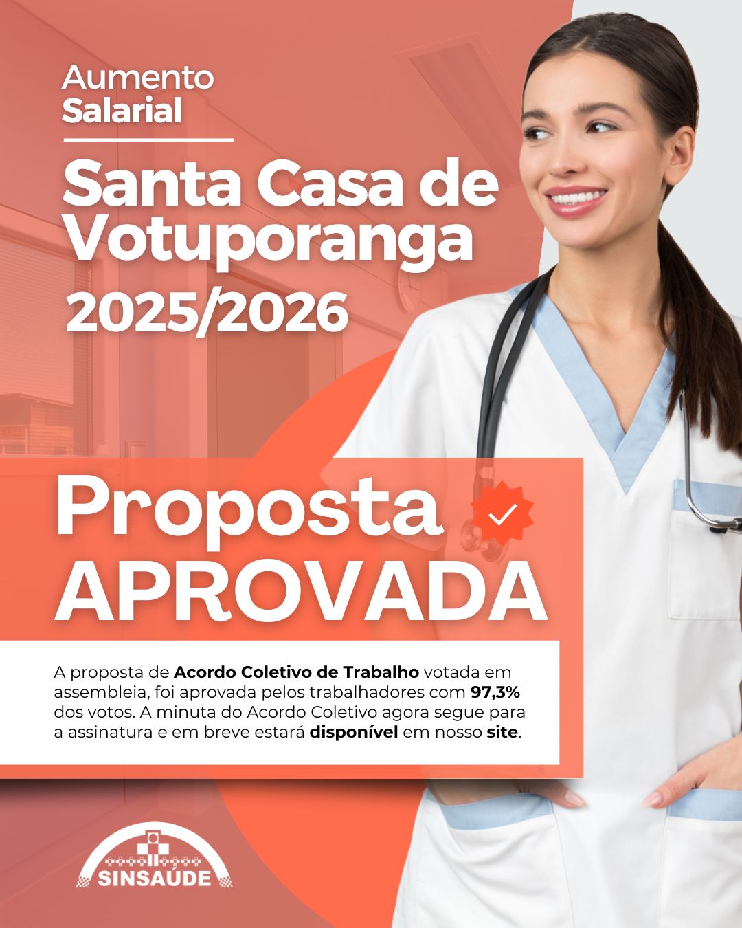 Aumento Salarial 2025 – Proposta de Pauta APROVADA! 💪 A proposta de Acordo Coletivo de Trabalho dos trabalhadores da SANTA CASA DE VOTUPORANGA, foi aprovada pelos trabalhadores com 97,3% dos votos. Agora, a minuta segue para assinatura e, em breve, estará disponível no nosso site. ✅ ✅ Seguimos firmes na luta por melhores condições para os trabalhadores da saúde! 📞 Contato SinSaúde Rio Preto: Telefone: (17) 3211-2525 ou WhatsApp: (17) 99794-8476 🕗Horário de atendimento:🕗 Segunda a Sexta-feira⏰ Manhã: 08h às 11h30⏰ Tarde: 12h30 às 17h 📍 Endereço: Rua Imperial, 843, Vila Imperial.
