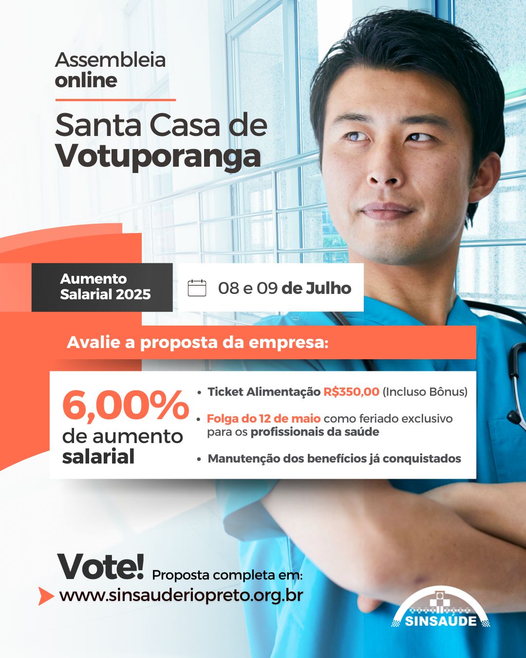 ⚠️ ATENÇÃO, TRABALHADORES DA SANTA CASA DE VOTUPORANGA 📈 AVALIE A PROPOSTA 📈 Proposta Completa: https://sinsauderiopreto.org.br/santa-casa-de-votuporanga2025/ O SinSaúde Rio Preto convoca todos os trabalhadores da SANTA CASA DE VOTUPORANGA para a Assembleia Extraordinária Virtual sobre o Acordo Coletivo – Aumento Salarial 2025/2026. 🗳️ Votação online: 📅 Quando: De 08/07 às 9h até 09/07/2025 às 24h.🖥️ Onde: Site oficial do sindicato ( https://sinsauderiopreto.org.br ) ou no app SinSaúde Rio Preto. Pauta:✔️ Apreciação e votação da proposta de Acordo Coletivo – Aumento Salarial 2025/2026✔️ Autorização para o sindicato firmar o acordo ⚠️ Fique atento ao horário! A votação começa às 9h do dia 08/07/2025 (terça-feira) e finaliza às 24h do dia 09/07/2025 (quarta-feira). Participe! 🔄 Compartilhe com seus colegas! Não deixe de exercer seu direito! 💪 Mais informações: 📞 (17) 3211-2525 ou (17) 99794-8476