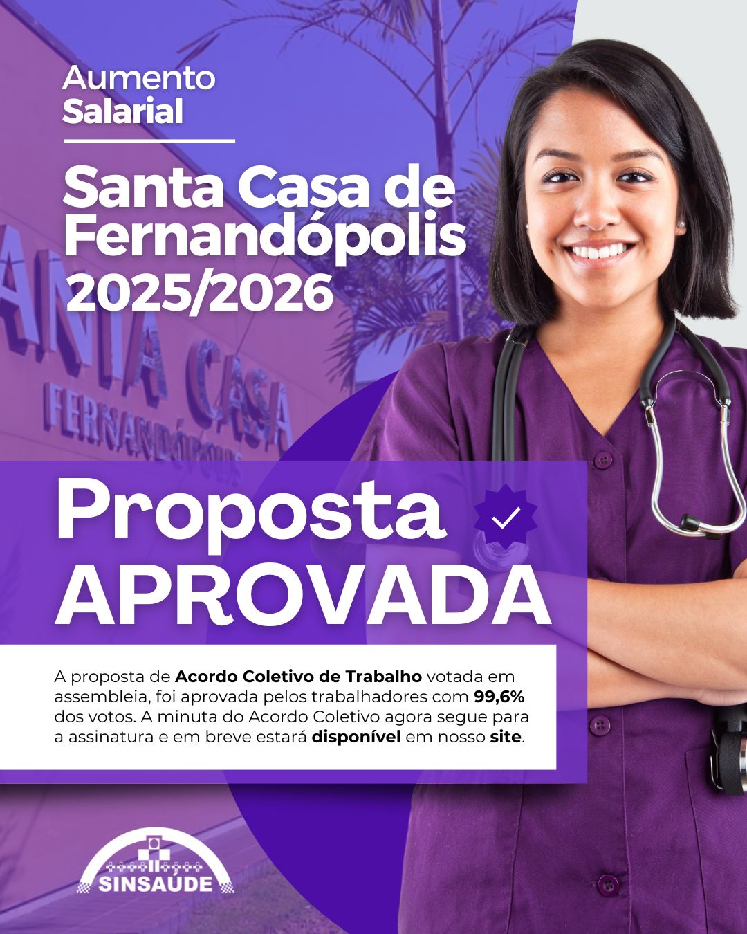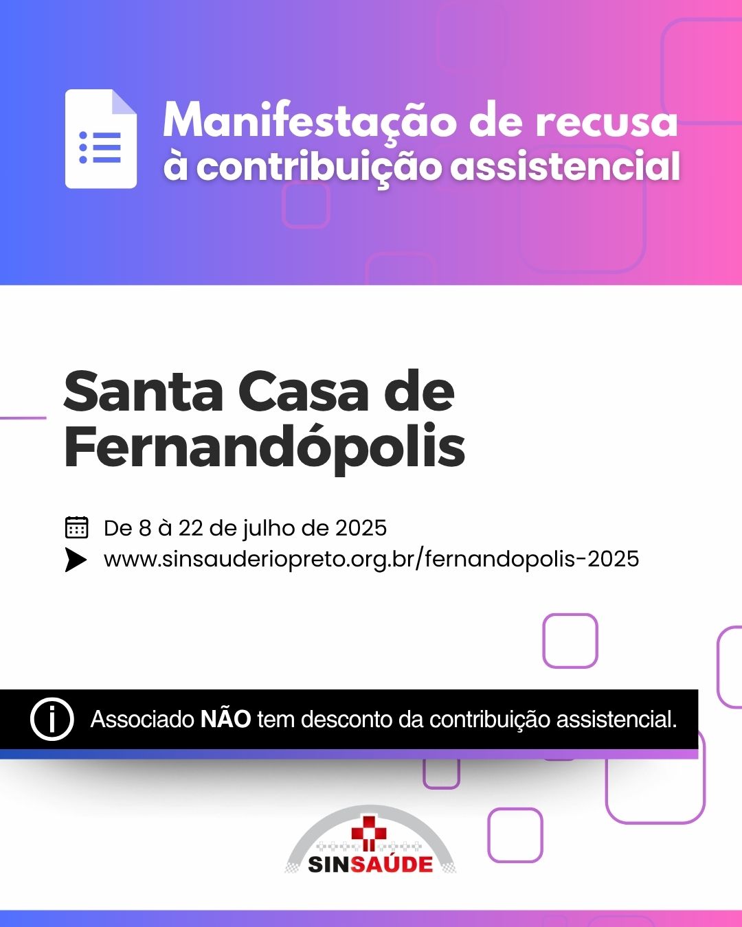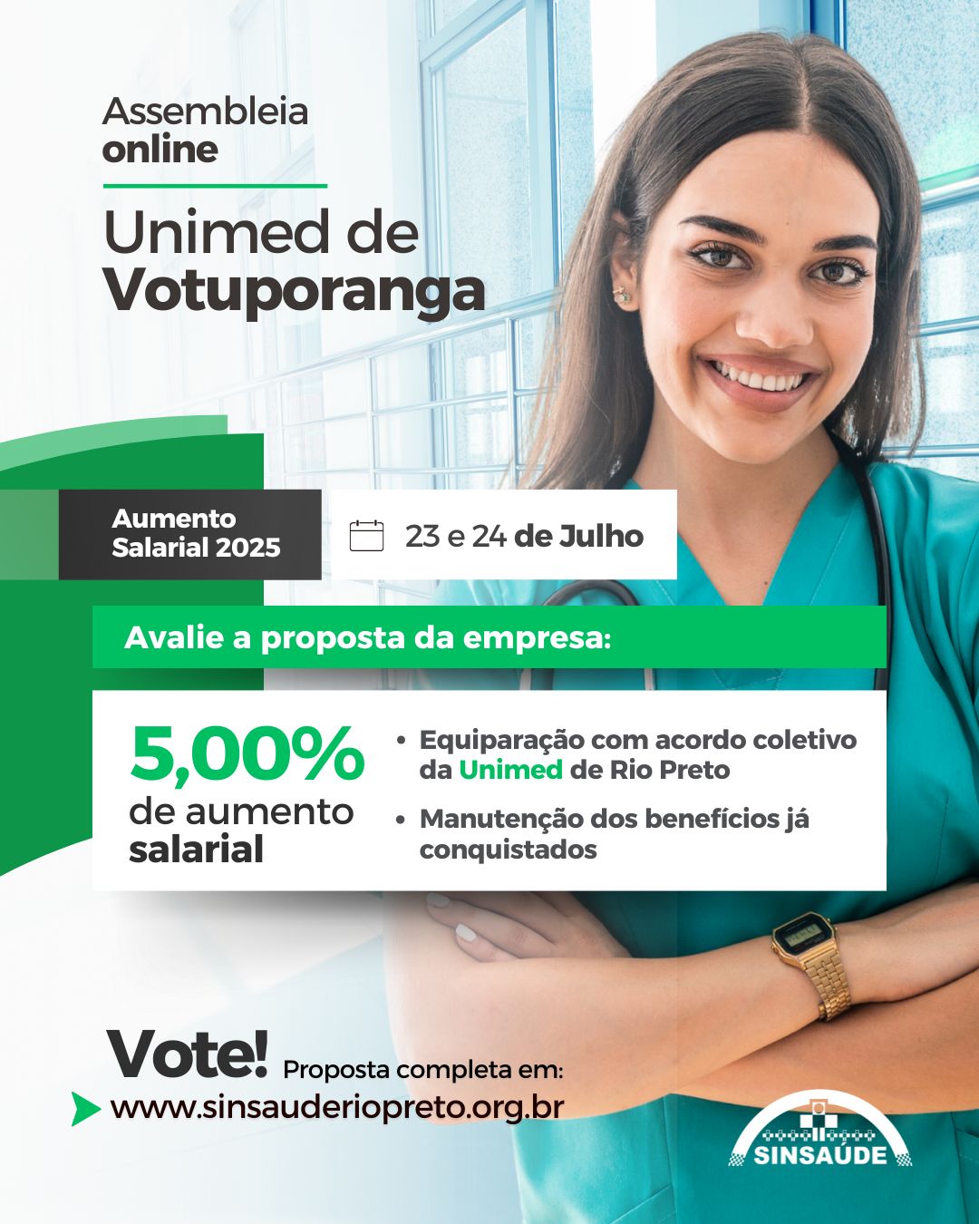 EDITAL DE CONVOCAÇÃO ASSEMBLÉIA EXTRAORDINÁRIA ESPECÍFICA DOS TRABALHADORES DA SANTA CASA DE MISERICÓRDIA DE VOTUPORANGA, À SER REALIZADA NA FORMA VIRTUAL (ART. 13º, § 8º, DO ESTATUTO SOCIAL) O Presidente do SINDICATO DOS AUXILIARES E TÉCNICOS DE ENFERMAGEM E EMPREGADOS EM ESTABELECIMENTOS DE SERVIÇOS DE SAÚDE DE SÃO JOSÉ DO RIO PRETO – SINSAÚDE RIO PRETO (denominação conforme alteração aprovada em assembleia realizada em 04.04.2025), no uso de suas atribuições legais e estatutárias (art. 13º, § 2º, I), resolve convocar todos os trabalhadores da SANTA CASA DE MISERICÓRDIA DE VOTUPORANGA, inscrita no CNPJ sob nº 72.957.814/0001-20 e estabelecida e com sede na Rua Minas Gerais, nº 3.051, Bairro Santa Eliza, Votuporanga/SP, CEP 15500-003, integrantes da categoria, associados ou não ao Sindicato, para reunirem-se em Assembleia Extraordinária Específica, que ocorrerá mediante a utilização de meios virtuais dos dias 08 a 10 de julho de 2025, com início às 09:00 (nove) horas em primeira convocação, ou em segunda convocação meia hora após. A Assembleia será transmitida pela internet, com participação direta dos representados, via site oficial do Sindicato, ocorrendo também a gravação simultânea seguida da divulgação da gravação para ampliação do acesso aos representados, que se estenderá até o término do período de votação. A votação estará disponível por escrutínio secreto desde o dia 08 de julho, em sistema digital que será disponibilizado pelo Sindicato mediante o respectivo cadastro, com a seguinte pauta de discussão e deliberação sobre as providências necessárias para dar curso às negociações visando a celebração de acordo coletivo de trabalho 2025-2026, para viger de 1º.05.2025 a 30.04.2026: A) Deliberação pela Assembleia, de aceitação dos termos do presente Edital e das providências tomadas para a realização da presente Assembleia Extraordinária Específica na forma virtual; B) Apreciação, deliberação e votação da contraproposta de acordo coletivo de trabalho 2025/2026 oferecida pela empresa; C) Autorização e outorga de poderes para o Sindicato, por meio de sua Diretoria, para celebração de Acordo Coletivo de Trabalho Específico e Aditivos; D) Fixação da contribuição assistencial, forma de pagamento, direito de oposição e autorização para que a empresa proceda ao desconto em folha de pagamento e repasse ao Sindicato; Nos termos do art. 13º, §8º, do Estatuto, a votação por escrutínio secreto, de maneira virtual, com efetivo registro da assinatura digital do participante, para fins de ampliação da participação dos interessados terá continuidade até às 24:00h do dia 09 de julho. Após, a Assembleia prosseguirá para que seja realizada a apuração do resultado da votação, o qual será divulgado pelo Sindicato na Ata respectiva e site oficial. O EXERCÍCIO DO VOTO POR MEIO VIRTUAL (A DISTÂNCIA), se dará nos termos deste edital e de conformidade com as disposições que seguem: 1) O cadastro e o acesso ao ambiente do “VOTO VIRTUAL” serão feitos por meio do site oficial do Sindicato (www.sinsauderiopreto.org.br) e do aplicativo SINSAUDE RIO PRETO, que deverá ser baixado gratuitamente por meio da Play Store, para ser utilizado em dispositivos móveis (celular e tablet) ou computadores e notebooks. 2) A votação deverá ocorrer do início da assembleia até o término do período de votação, às 24:00h do dia 09 de julho de 2025, por meio do site oficial do Sindicato (www.sinsauderiopreto.org.br) ou do aplicativo SINSAUDE RIO PRETO, no ícone “Assembleia Santa Casa de Votuporanga 2025 – Vote Aqui”. 3) A proposta à ser apreciada, deliberada e votada, estará disponível para consulta e sugestão no site oficial do Sindicato (www.sinsauderiopreto.org.br). São José do Rio Preto, 03 de julho de 2.025. Reinaldo Dalur de Souza Diretor Presidente