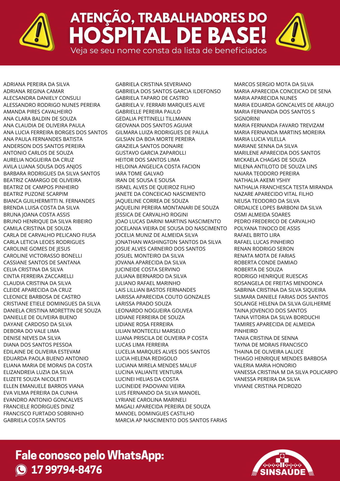 ⚠️ ÚLTIMA CHAMADA PARA RECEBIMENTO DOS VALORES DA AÇÃO DO TICKET⚠️ O juiz responsável pela ação coletiva do ticket-alimentação estipulou um PRAZO FINAL para o pagamento dos trabalhadores beneficiados. ⏳ Se o valor não for retirado dentro do prazo, ele retornará ao processo e o trabalhador perderá a chance de receber agora. 🗓️ Data final para o recebimento: 22/08/2025 📌 Trata-se do ressarcimento referente a descontos indevidos no ticket-alimentação por faltas entre setembro/2021 e fevereiro/2023. Se o seu nome estiver na lista, VOCÊ TEM VALORES A RECEBER! 👉🏻 Veja se seu nome consta da lista de beneficiados. O prazo está se esgotando! 📞 Fale conosco URGENTE pelo WhatsApp: (17) 99794-8476 LISTA DE BENEFICIADOS: ADRIANA PEREIRA DA SILVAADRIANA REGINA CAMARAMANDA PIRES CAVALHEIROANA CLARA BALDIN DE SOUZAANA CLAUDIA DE OLIVEIRA PAULAANA LUCIA FERREIRA BORGES DOS SANTOSANA PAULA FERNANDES BATISTAANDERSON DOS SANTOS PEREIRAAURELIA NOGUEIRA DA CRUZAVILA LUANA SOUSA DOS ANJOSBARBARA RODRIGUES DA SILVA SANTOSBEATRIZ CAMARGO DE OLIVEIRABEATRIZ DE CAMPOS PINHEIROBEATRIZ PUZONE SCARPIMBIANCA GUILHERMITTI NOGUEIRA FERNANDESBRENDA LUISA COSTA DA SILVABRUNA JOANA COSTA ASSISBRUNO HENRIQUE DA SILVA RIBEIROCAMILA CRISTINA DE SOUZACARLA DE CARVALHO PELICANO FIUSACARLA LETICIA LEOES RODRIGUESCASSIANE SANTOS DE SANTANACELIA CRISTINA DA SILVACINTIA FERREIRA ZACCARELLICLAUDIA CRISTINA DA SILVACLEIDE APARECIDA DA CRUZCLEONICE BARBOSA DE CASTROCRISTIANE ETIELE DOMINGUES DA SILVADANIELA CRISTINA MORETTIN DE SOUZADANIELLE DE OLIVEIRA BUENODAYANE CARDOSO DA SILVADEBORA DO VALE LIMADENISE NEVES DA SILVAEDILAINE DE OLIVEIRA ESTEVAMEDUARDA PAOLA BUENO ANTONIOELIANA MARIA DE MORAIS DA COSTAELIZANDREIA LUZIA DA SILVAELIZETE SOUZA NICOLETTIEVA VILMA PEREIRA DA CUNHAEVANDRO ANTONIO GONCALVESFRANCIELE RODRIGUES DINIZFRANCISCO FURTADO SOBRINHOGABRIELA CRISTINA SEVERIANOGABRIELA DOS SANTOS GARCIA ILDEFONSOGABRIELA TAPARO DE CASTROGABRIELA VICTORASSO FERRARI MARQUES ALVEGABRIELLE PEREIRA PAULOGEDALIA PETTINELLI TILLMANNGEOVANA DOS SANTOS AGUIARGILMARA LUIZA RODRIGUES DE PAULAGILSIAN DA BOA MORTE PEREIRAGUSTAVO GARCIA ZAPAROLLIHEITOR DOS SANTOS LIMAHELOINA ANGELICA COSTA FACIONIARA TOME GALVAOIRAN DE SOUSA E SOUSAISRAEL ALVES DE QUEIROZ FILHOJANETE DA CONCEICAO NASCIMENTOJAQUELINE CORREA DE SOUZAJAQUELINI PEREIRA MONTANARI DE SOUZAJESSICA DE CARVALHO ROGINIJOAO LUCAS DARINI MARTINS NASCIMENTOJOCELANIA VIEIRA DE SOUSA DO NASCIMENTOJOCELIA MUNIZ DE ALMEIDA SILVAJONATHAN WASHINGTON SANTOS DA SILVAJOSUE ALVES CARNEIRO DOS SANTOSJOSUEL MONTEIRO DA SILVAJOVANA APARECIDA DA SILVAJUCINEIDE COSTA SERVINOJULIANA BERNARDO DA SILVAJULIANO RAFAEL MARINHOLAIS LILLIAN BASTOS FERNANDESLARISSA APARECIDA COUTO GONZALESLARISSA PRADO SOUZALEONARDO NOGUEIRA GOUVEALIDIANE FERREIRA DE SOUZALIDIANE ROSA FERREIRALILIAN MONTECELI MARSELOLUANA PRISCILA DE OLIVEIRA P COSTALUCAS LIMA FERREIRALUCELIA MARQUES ALVES DOS SANTOSLUCIA HELENA REDIGOLOLUCIANA MIRELA MENDES MALUFLUCINA VALIANTE VENTURALUCINEI HELIAS DA COSTALUCINEIDE PADOVANI VIEIRALUIS FERNANDO DA SILVA MANOELLYRIANE CAROLINA MARINELIMAGALI APARECIDA PEREIRA DE SOUZAMANOEL DOMINGUES CASTILHOMARCOS SERGIO MOTA DA SILVAMARIA APARECIDA CONCEICAO DE SENAMARIA EDUARDA GONCALVES DE ARAUJOMARIA FERNANDA FAVARO TREVIZAMMARIA FERNANDA MARTINS MOREIRAMARIA LUCIA VILELLAMARIANE SENNA DA SILVAMARILENE APARECIDA DOS SANTOSMICKAELA CHAGAS DE SOUZAMILENA ANTILOTO DE SOUZA LINSNAIARA TEODORO PEREIRANATHALIA AKEMI YSHIYNATHALIA FRANCHESCA TESTA MIRANDANEUSA TEODORO DA SILVAORDALICE LOPES BARBONI DA SILVAOSMI ALMEIDA SOARESPEDRO FREDERICO DE CARVALHOPOLYANA TINOCO DE ASSISRAFAEL LUCAS PINHEIRORENAN RODRIGO SERONRENATA MOTA DE FARIASROBERTA CONDE DAMIAOROBERTA DE SOUZARODRIGO HENRIQUE RUESCASROSANGELA DE FREITAS MENDONCASABRINA CRISTINA DA SILVA SIQUEIRASILMARA DANIELE FARIAS DOS SANTOSSOLANGE HELENA DA SILVA GUILHERMETAINA JOVENCIO DOS SANTOSTAINA VITORIA DA SILVA BORDUCHITANIA CRISTINA DE SENNATAYNA DE MORAIS FRANCISCOTHAINA DE OLIVEIRA LALUCEVANESSA CRISTINA M DA SILVA POLICARPOVANESSA PEREIRA DA SILVAVIVIANE CRISTINA PEDROZO